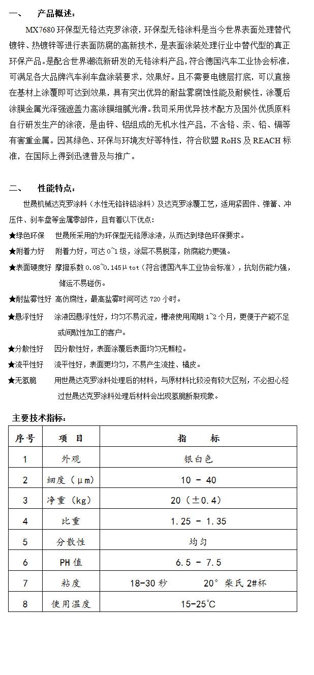 產品名稱:MX7680環保型無鉻達克羅涂液